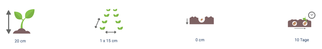 - Aussaat: März bis Oktober, mehrere Etappen möglich, direkt ins Feld oder in Töpfe