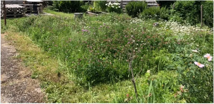 Et en parlant d’hiver, j’ai laissé la zone refuge sans jamais la faucher car les insectes auront pondu des œufs et ceux-ci seront protégés du froid grâce aux hautes herbes.